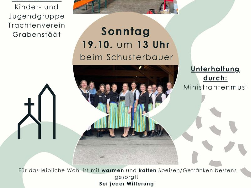 Kirchweihkranzl mit Kirtahutschn der Dirndlschaft Erlstätt. Es finden Auftritte von der Kinder- und Jugendgruppe des Trachtenvereins Grabenstätt statt. Zur Unterhaltung spielt die: "Ministrantenmusi", für das leibliche Wohl ist mit warmen und kalten Speisen/Getränken bestens gesorgt! Findet bei jeder Witterung statt.