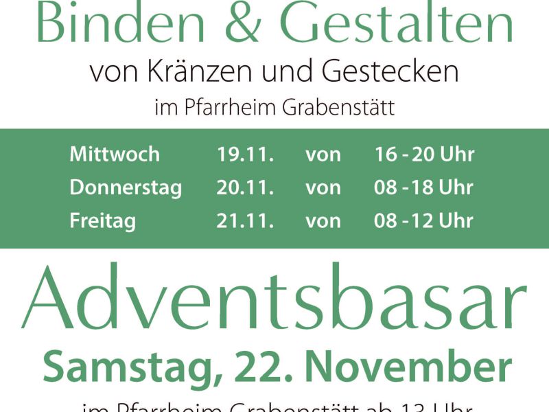 Die Frauengemeinschaft Grabenstätt lädt herzlich ein zum Binden & Gestalten von Kränzen und Gestecken im Pfarrheim Grabenstätt.
