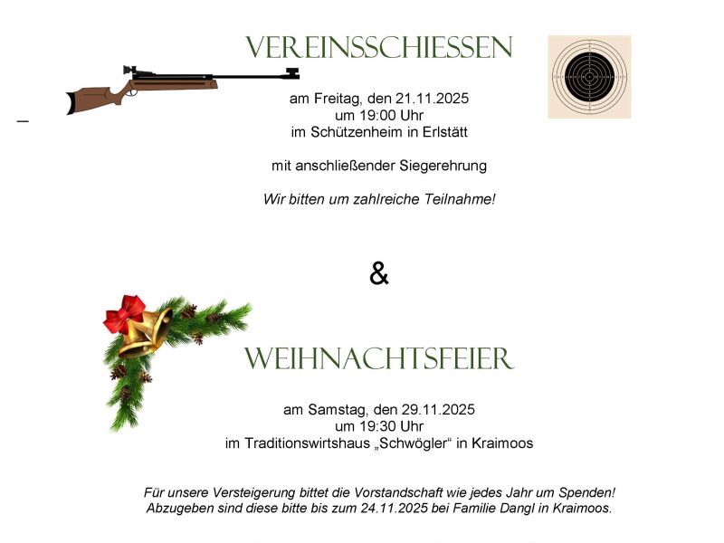 Liebe Vereinsmitglieder, auch in diesem Jahr möchten wir euch zu folgender Veranstaltung herzlich einladen: Vereinsschießen am Freitag, den 21.11.2025 um 19:00 Uhr im Schützenheim in Erlstätt mit anschließender Siegerehrung! Wir bitten um zahlreiche Teilnahme.