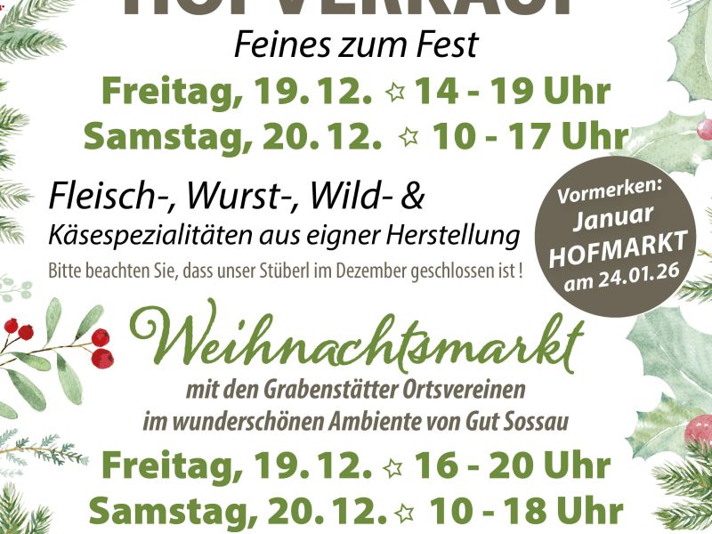 Am Freitag, den 19. Dezember 2025 und Samstag, den 20. Dezember 2025 findet wieder ein Hofverkauf und Weihnachtsmarkt mit den Grabenstätter Ortsvereinen im wunderschönen Ambiente von Gut Sossau statt. Es erwarten Sie kulinarische Spezialitäten aus eigener Herstellung, sowie Handwerkskunst, eine Wichtelwerkstatt für Kinder und eine Vielfalt von musikalischen Darbietungen. Ausreichend Parkmöglichkeiten finden Sie auf dem Gelände von Fossil. Von dort aus erreichen Sie uns über einen gut ausgeschilderten Fußweg oder mit unserem extra eingerichteten Busshuttle! Der Hofladen öffnet am Freitag von 14 Uhr bis 19 Uhr und der Weihnachtsmarkt von 16 Uhr bis 20 Uhr. Am Samstag öffnet der Hofladen von 10 Uhr bis 17 Uhr und der Weihnachtsmarkt von 10 Uhr bis 18 Uhr.