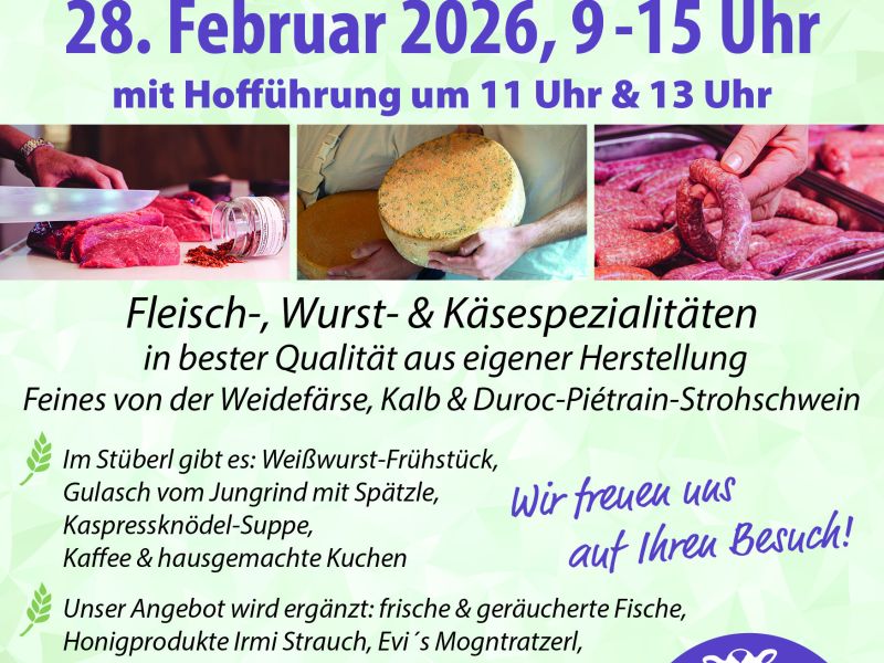 "Regional einkaufen". Hofführungen um 11:00 und um 13:00 Uhr. Fleisch-, Wurst- und Käsespezialitäten aus eigener Herstellung. frische und geräucherte Fische, Honigprodukte von Irmi Strauch, Evi`s Mogntratzerl, Bio-Sauerteigbrote von der Brotquelle Prien. Musikalische Unterhaltung mit der "Ribisl Musi". Im Stüberl gibt es: Weißwurst-Frühstück, Gulasch vom Jungrind mit Spätzle, Kaspressknödel-Suppe, Kaffee und hausgemachte Kuchen. - Bücherflohmarkt zugunsten der Pflege-Stiftung Meltl (keine externen Aussteller) -
