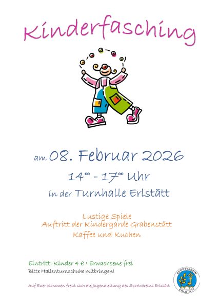 SV Erlstätt: Kinderfasching in der Turnhalle Erlstätt. Lustige Spiele, Auftritt der Kindergarde Grabenstätt, Kaffee und Kuchen Bitte Hallenturnschuhe mitbringen! Eintritt: Kinder 4 €, Erwachsene frei